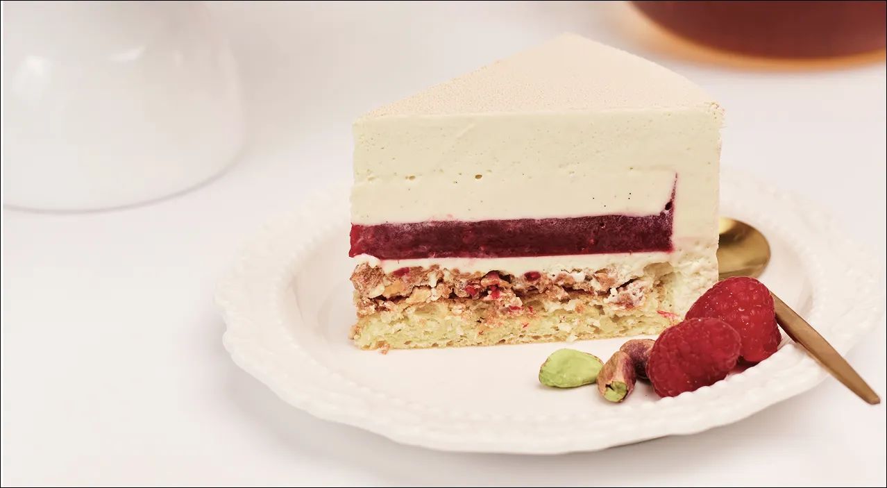 - хрустящий слой с бельгийской вафлей, изумрудной фисташкой и малиновыми криспи